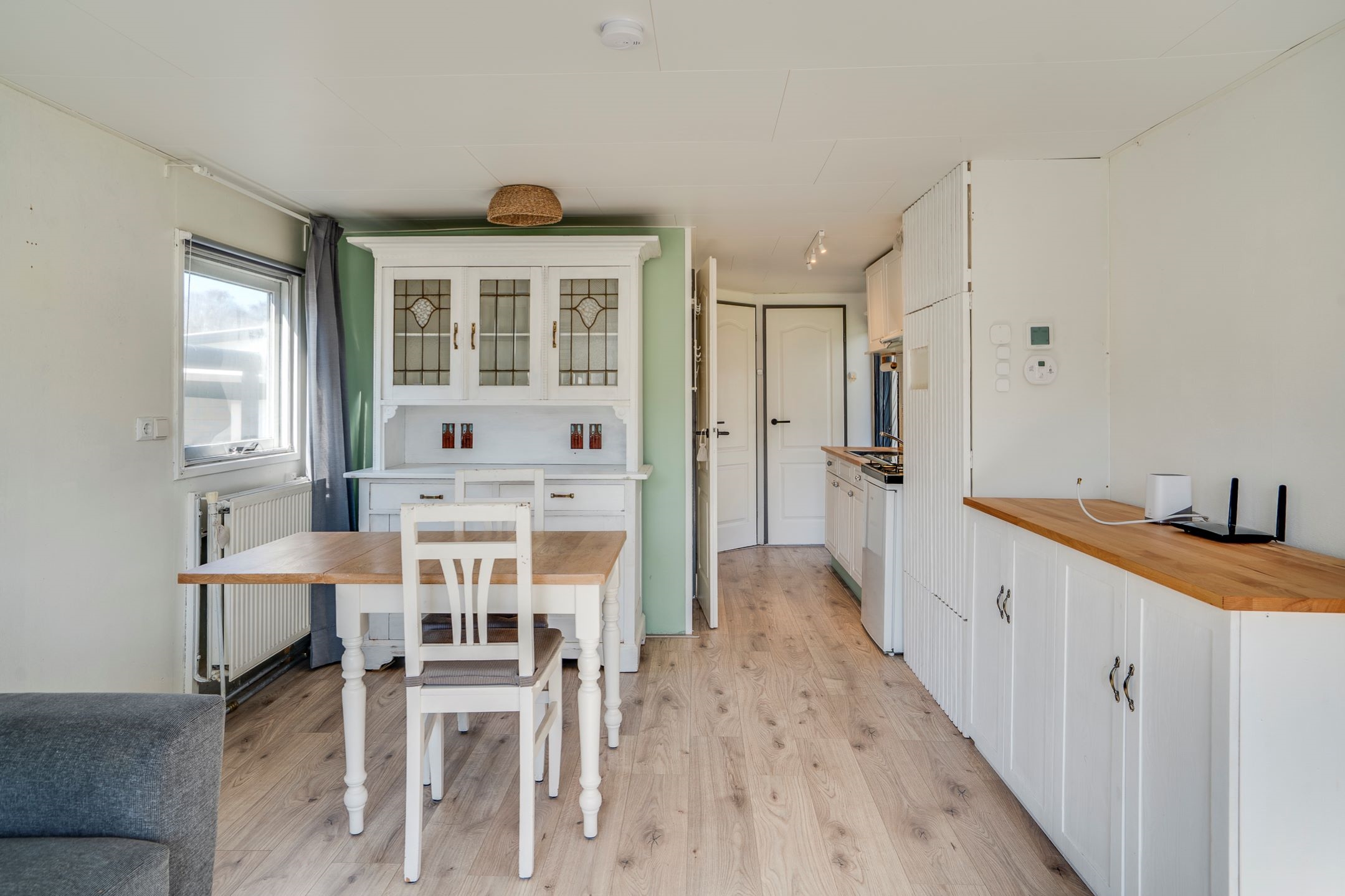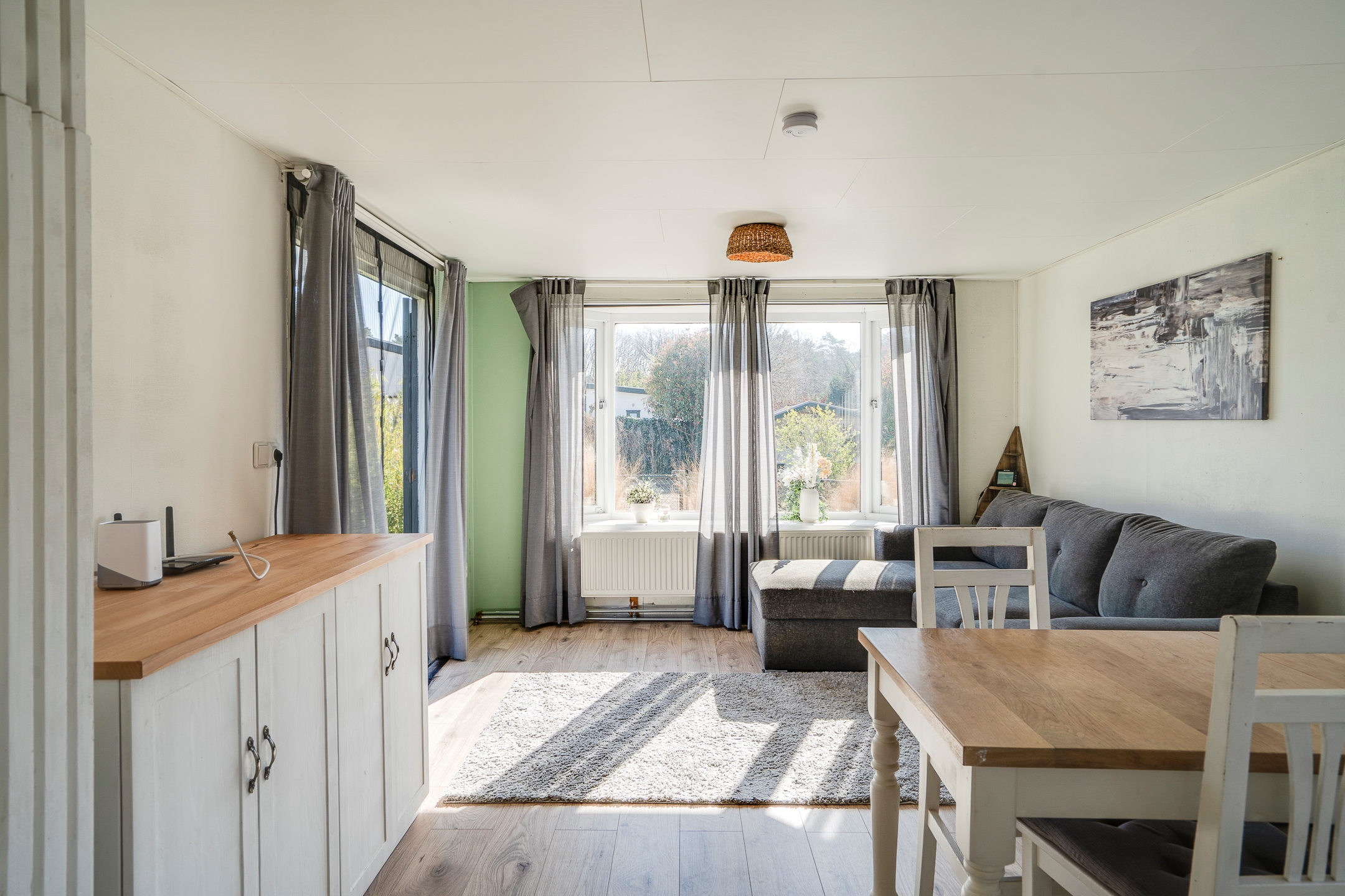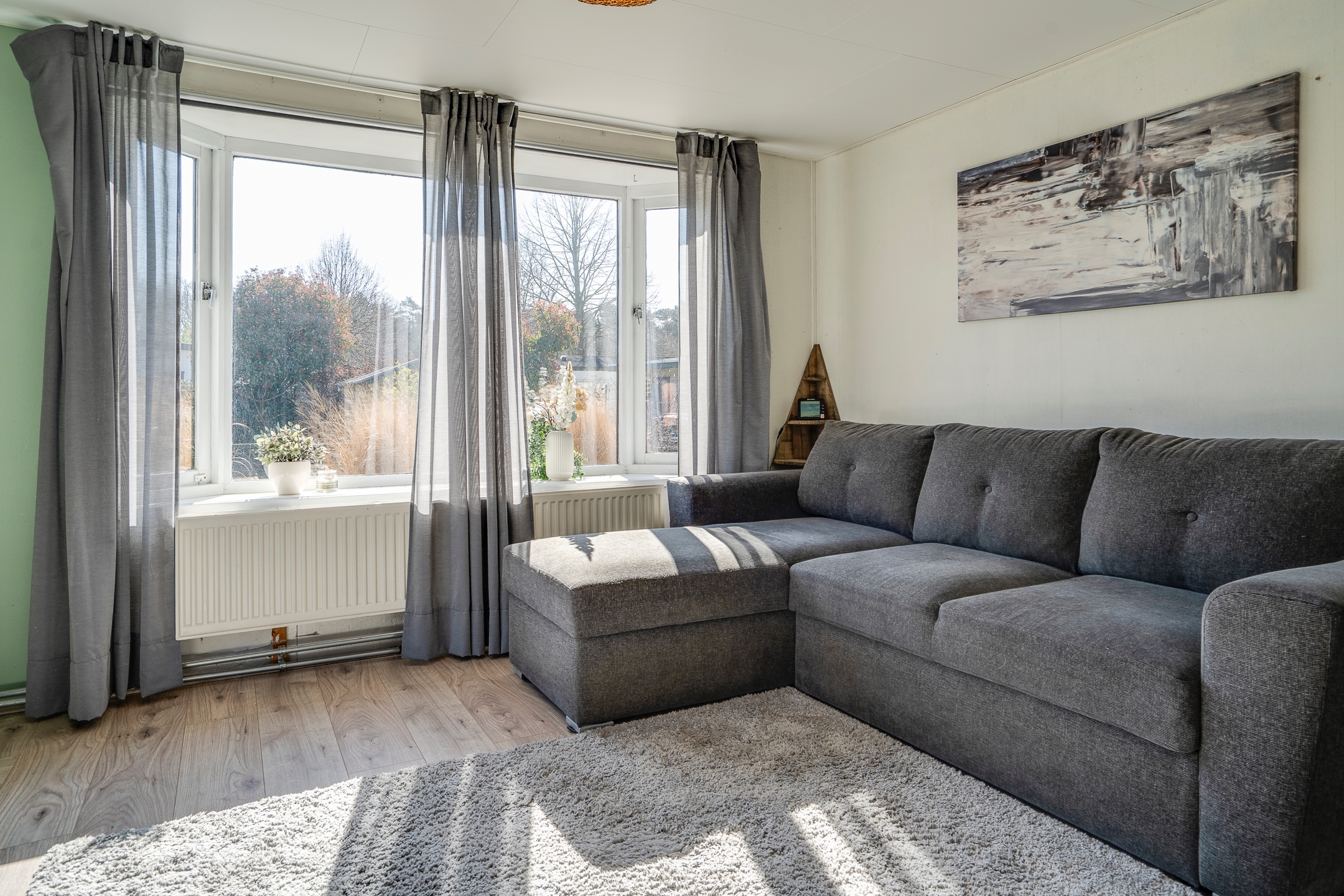 De sfeervolle woonkamer (ca. 22 m²) staat in directe verbinding met de fraai aangelegde tuin mede dankzij de dubbele terrasdeuren. Grote raampartijen zorgen voor een prettige lichtinval en een ruimtelijk gevoel. De halfopen keuken is praktisch ingericht en voorzien van een kookplaat, afzuigkap en koelkast.