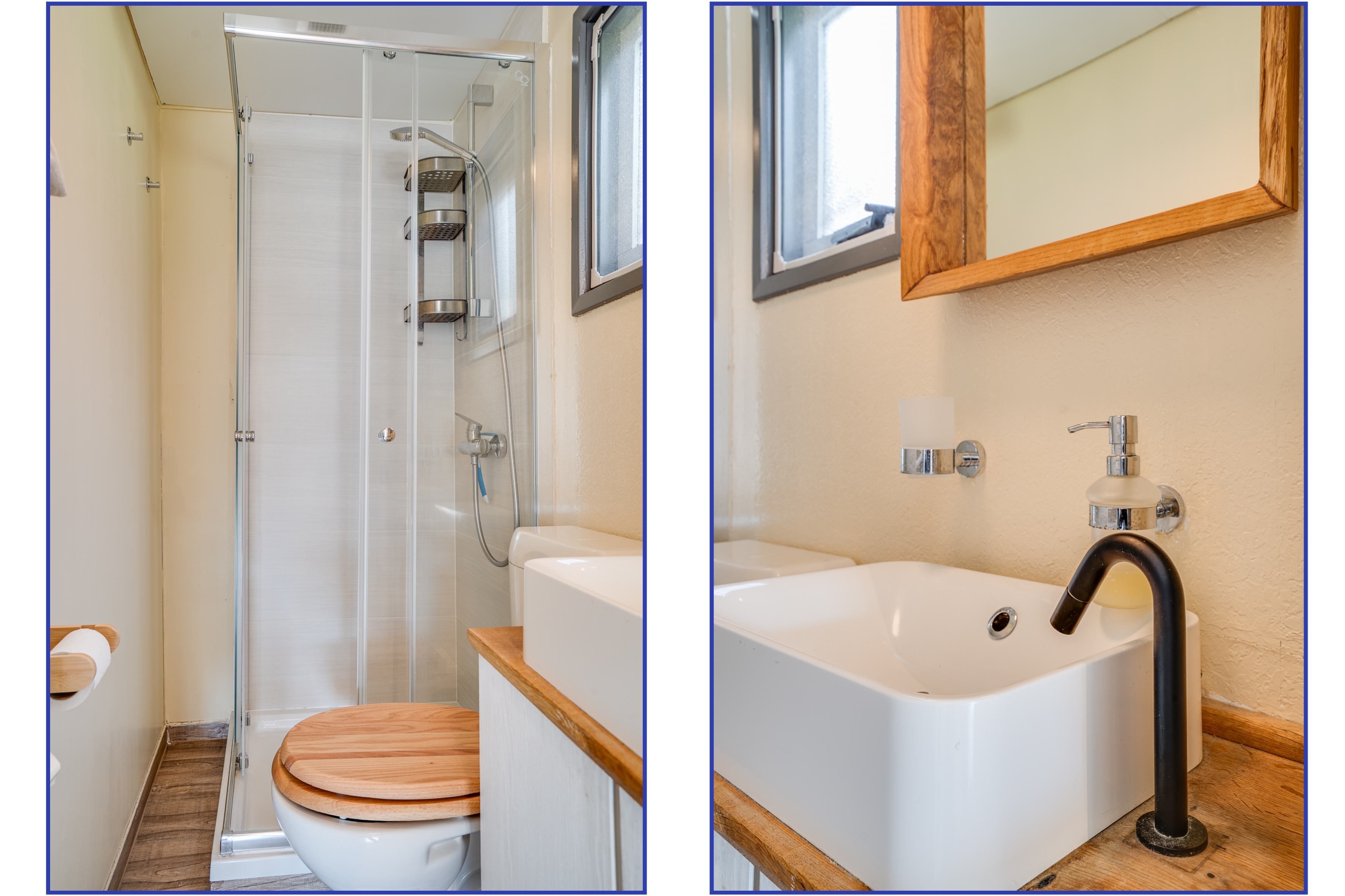 Oorspronkelijk beschikte het chalet over twee slaapkamers die momenteel zijn samengevoegd tot één royale slaapkamer. Indien gewenst is de oorspronkelijke indeling eenvoudig te herstellen. De badkamer is in 2023 volledig vernieuwd en voorzien van een douche, toilet en wastafel – strak, fris en instapklaar!
